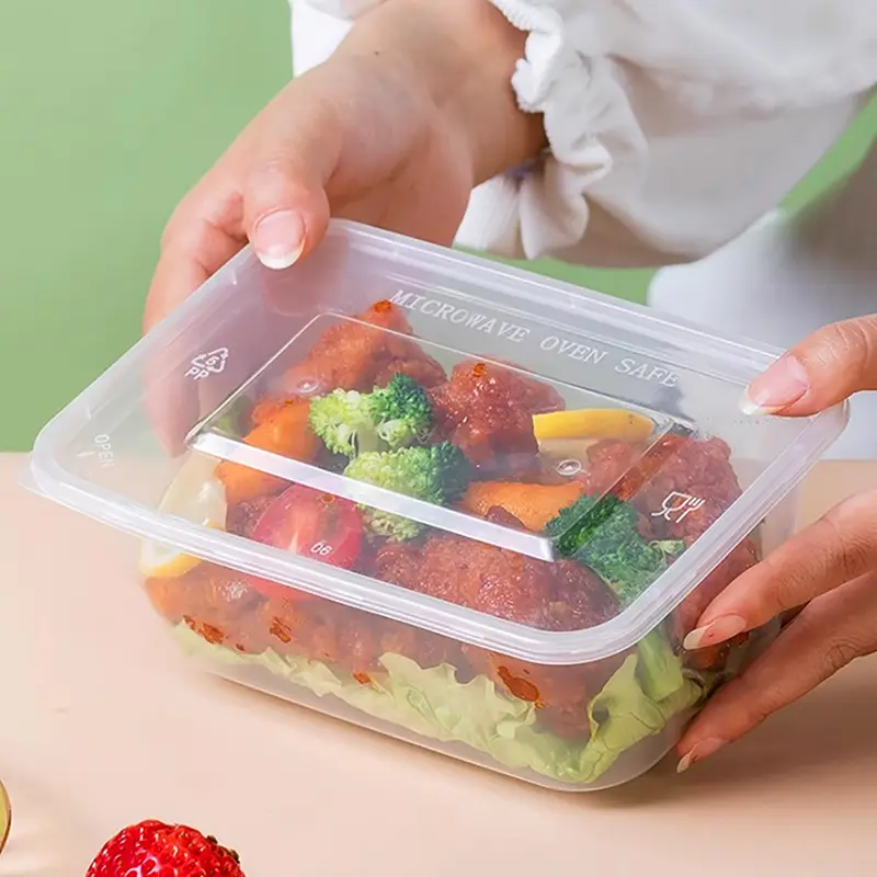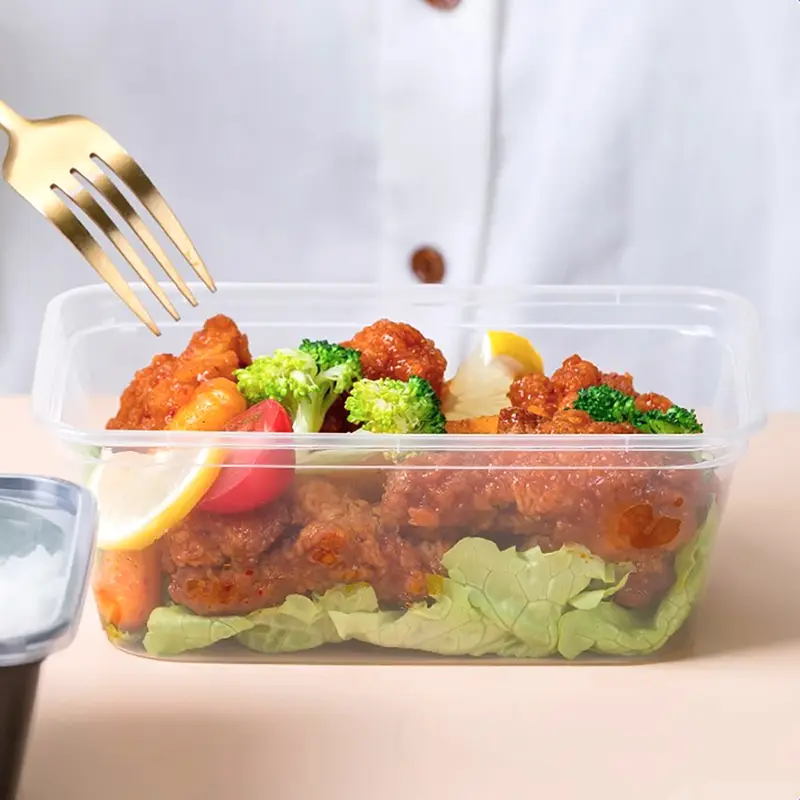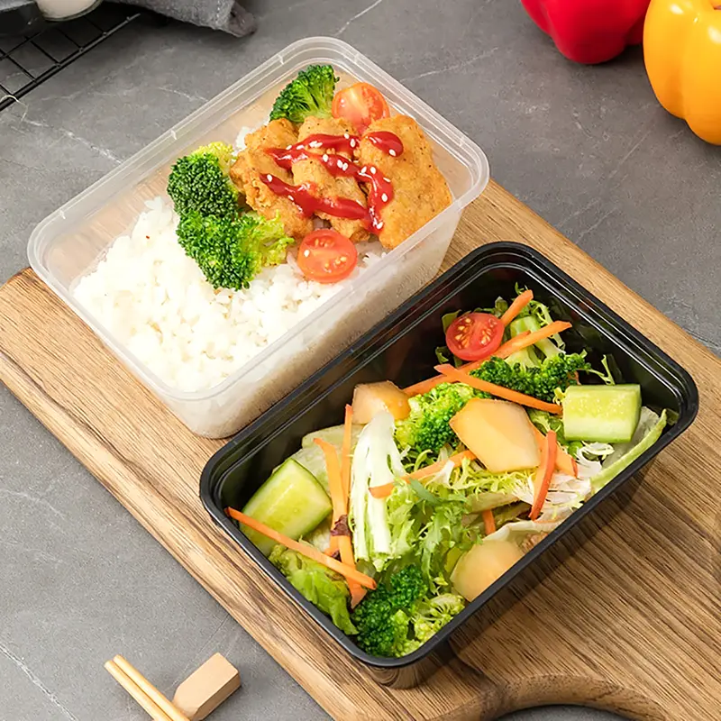 Ningbo Powerr suministra contenedores de alimentos de plástico rectangulares transparentes de bajo precio de 750 ml en China. Hecho de material seguro, contiene comidas calientes, se puede refrigerar o calentar en el microondas brevemente, sin olor ni deformación. Su capacidad dorada de 750 ml se adapta perfectamente a la comida completa de una sola persona, acomodando platos principales y acompañamientos sin desperdicio. La base y la tapa herméticamente selladas evitan fugas de sopa, adecuadas para alimentos picantes. Su diseño superior más ancho e inferior más estrecho garantiza un apilamiento estable, conveniente para la preparación a granel de los comerciantes y el almacenamiento de los usuarios, al tiempo que maximiza el espacio. Las versiones transparentes muestran claramente los alimentos, las negras ocultan los residuos; También se encuentran disponibles colores personalizados, impresión y nuevas herramientas.